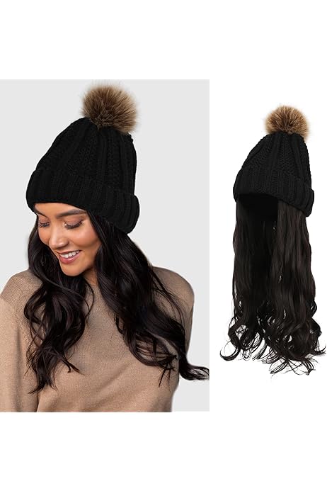 Amazon Com Qlenkay Beanie Hat With Long Wavy Curly Hair Extensions Knit Black Cap Attached 20inch Synthetic Wig Detachable Hairpiece Warm Pom For Women Winter Medium Brown Beauty Personal Care
